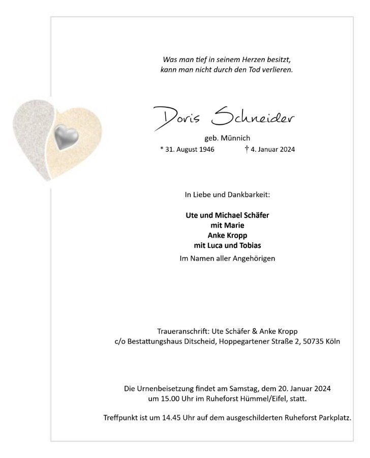 Liebe Doris, ich bin sehr traurig dass Du von uns gegangen bist ohne dass wir uns noch einmal sehen konnten. Leider wusste Deine Tochter das zu unterbinden. Ich habe viel an Dich gedacht. An unsere guten und auch schlechte Zeiten. Wir waren uns immer nah Schneiderlein. Seit über 50zig Jahre .Ruhe in Frieden. Deine Freundin Marion