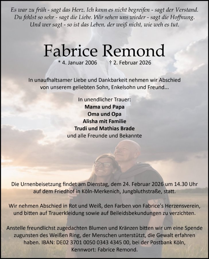 Es war zu früh - sagt das Herz. Ich kann es nicht begreifen - sagt der Verstand. Du fehlst so sehr - sagt die Liebe. Wir sehen uns wieder - sagt die Hoffnung. Und wer sagt - so ist das Leben, der weiß nicht, wie weh es tut.