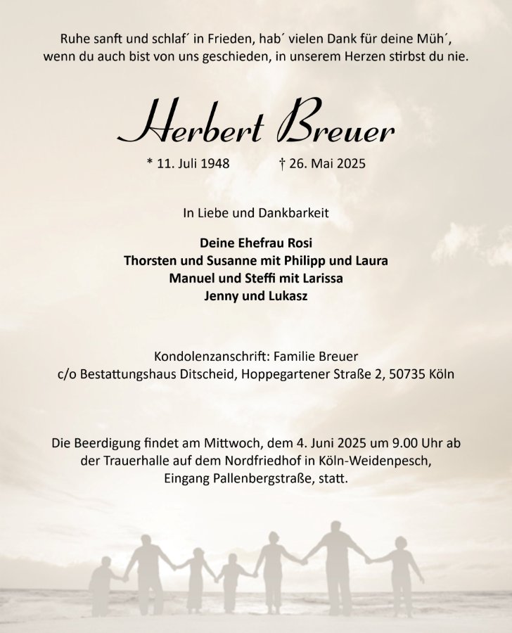 Möge die Erinnerung an die gemeinsamen Momente, an die Liebe und das Leben, das Herbert geführt hat, Euch in diesen schweren Tagen Kraft und Hoffnung schenken.