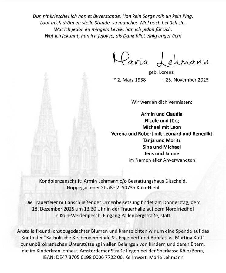 Dun nit kriesche! Ich han et üvverstande. Han kein Sorge mih un kein Ping. Loot mich dröm en stelle Stunde, su manches Mol noch bei üch sin. Wat ich jedon en mingem Levve, han ich jedon für üch. Wat ich jekunnt, han ich jejovve, als Dank bliet einig unger üch!